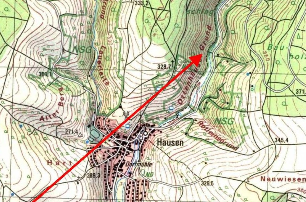 The position of Gorgones barn roof in Sennfeld and the location where the parachutes landed at Chalet Bad Sennfeld can be used to plot the remaining track of Flat Foot Floogie across the Main River to the crash site near the village of Hausen.