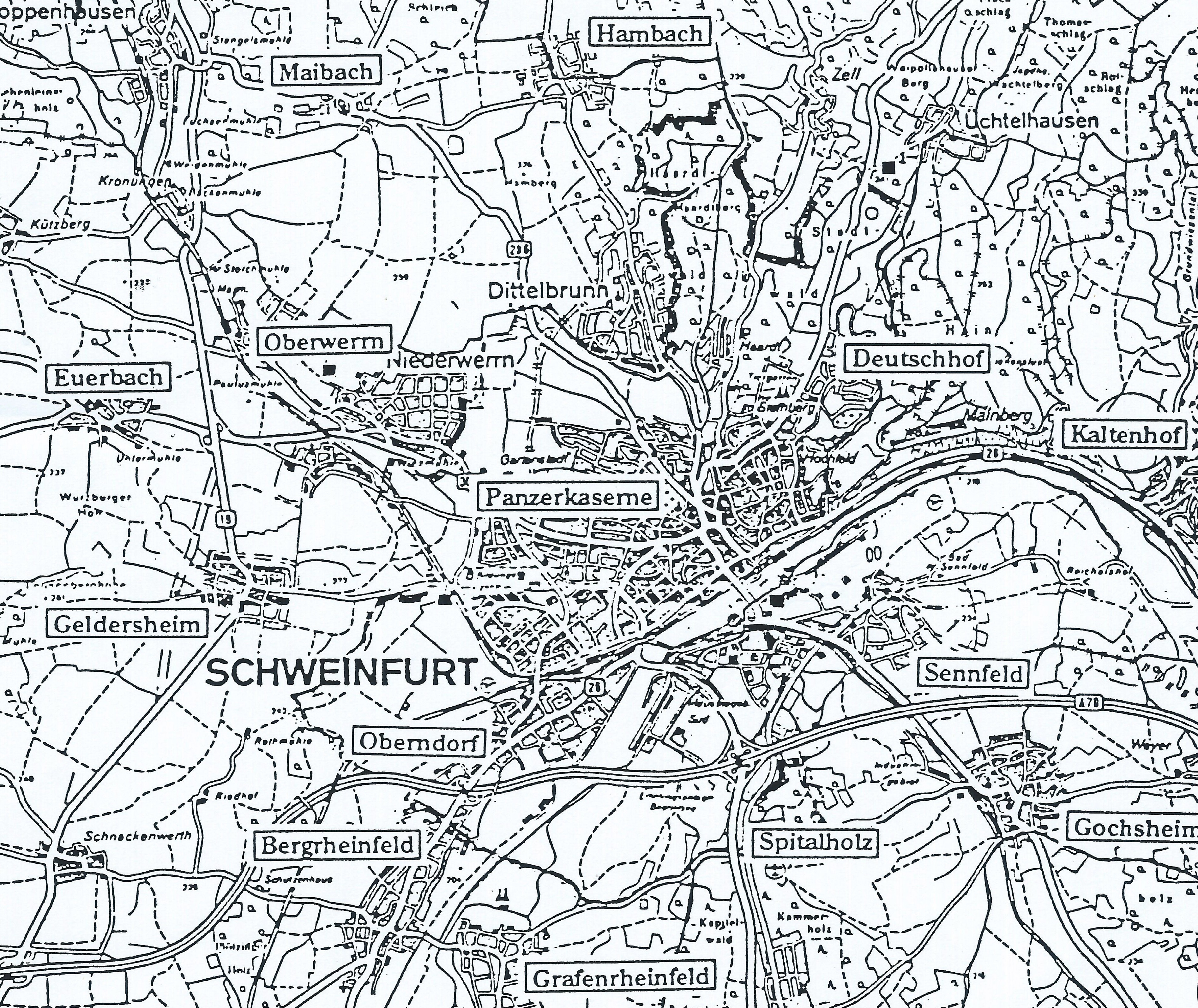 The crash site and debris field of Flat Foot Floogie at Hausen, 5 km NE of Schweinfurt,