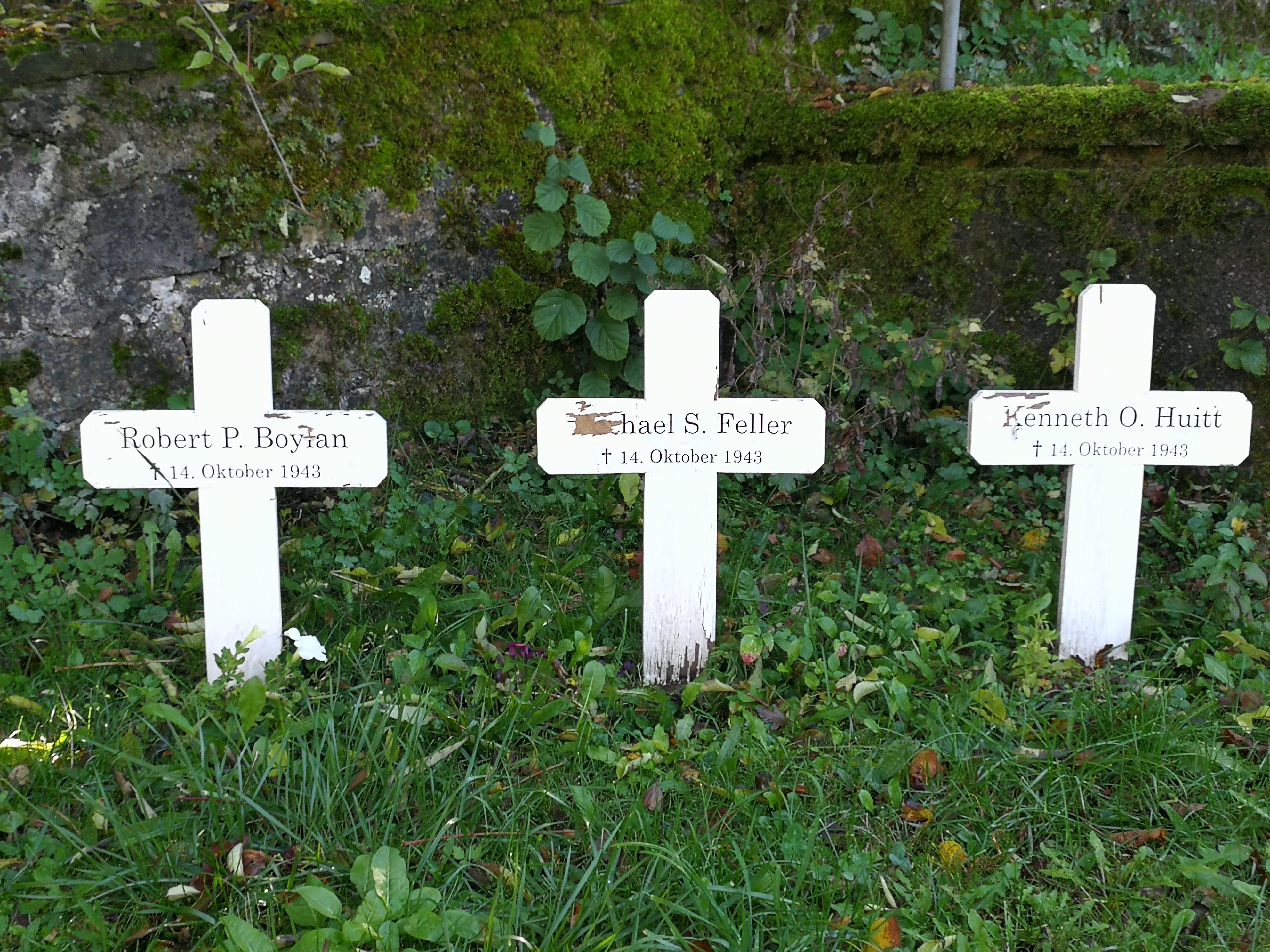 Clan OBoylan thanks Rita Steger-Frühwacht, chairwoman of the historical society of Hausen for caring for commemorative crosses of Robert Patrick Boylan, Michael S. Feller and Kenneth O. Huitt. During the 2015 visit of Gus Yorbas son Tony, Mrs. Steger lead a touching prayer for all of the victims of war and for the three aviators in particular.